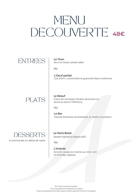 Le menu comprenant Mises en bouche / Entrée / Plat / Dessert