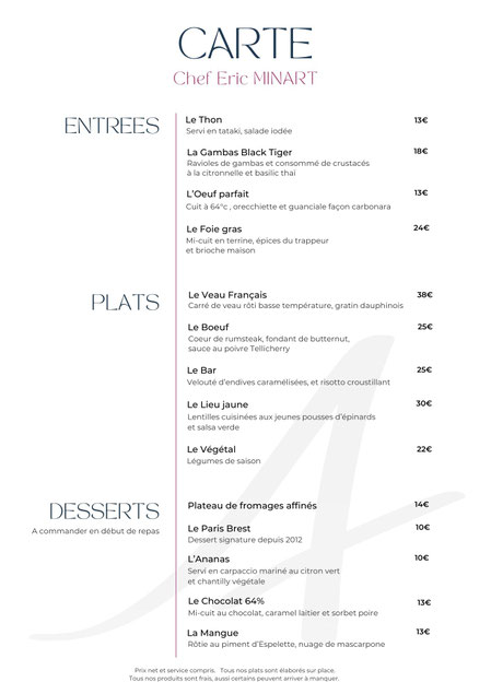 Le Chef Eric Minart vous propose une cuisine gourmande et toujours élaborée à partir de produits frais et de saison, pour seulement 28 € !